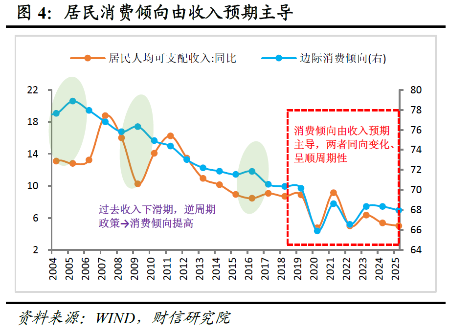 2025年消费总体保持平稳,但三方面的证据显示其增长动能仍待巩固。一是社零改善主要依靠以旧换新政策。2025年社会消费品零售总额同比增长3.7%,较上年提高0.2个百分点。其中,以旧换新相关品类消费拉动社零增长0.6个百分点,拉动幅度较上年提高0.3个百分点(见图3),贡献了社零全部增幅,其余类别消费增速反而有所放缓。二是服务消费增速相比上年放缓。2025年服务零售额同比增长5.5%,高于同期商品零售额和社零增速较多,但与其自身2024年的增速相比,实际上放缓了0.7个百分点,服务消费潜能仍待政策加力激活。三是居民人均消费支出增速和消费意愿双双回落。2025年居民人均消费支出增速较上年回落0.9个百分点至4.4%,其中居民人均可支配收入增速较上年回落0.3个百分点是原因之一,居民边际消费倾向较上年回落0.3个百分点(见图4),拖累同样显著。