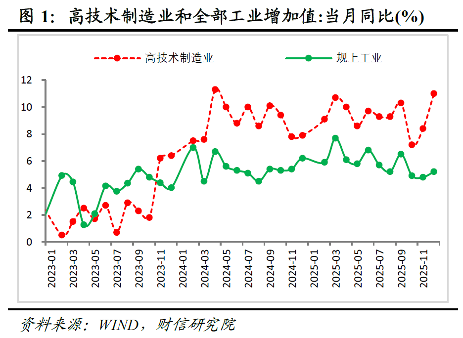 12月份生产端延续全年格局,新动能助力工业、服务业双双改善。一方面,当月规上工业增加值同比增长5.2%,较上月提高0.4个百分点。其中,受益于产业升级和出口改善的带动,高技术制造业增加值增长11%,较上月提高3.1个(见图1),为主要贡献力量;同期在反内卷政策和投资需求走弱的拖累下,上游采矿业、汽车制造等生产增速均明显回落。另一方面,服务业生产指数同比增长5%,较上月提高0.8个百分点。其中,信息传输软件和信息技术服务业、租赁和商务服务业、金融业生产指数分别较上月提高1.9、2.9、1.4个百分点,支撑作用显著,主要与多地加快“人工智能+”布局和金融市场回暖密切相关。