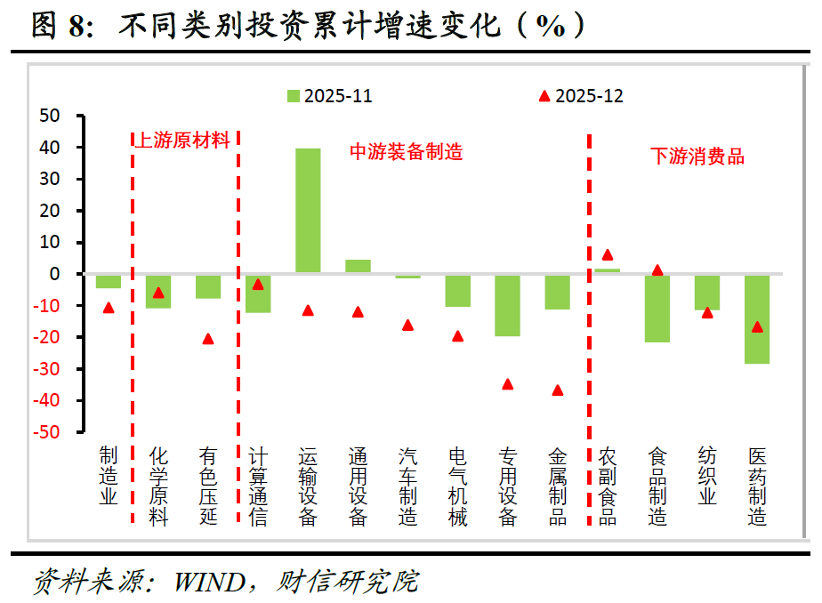 制造业投资受中上游行业拖累,降幅再度扩大。1-12月制造业投资同比增长0.6%,较1-11月回落1.3个百分点,下行有所加快;当月同比降幅达10.5%,较上月扩大6.1个百分点,为除疫情月份外首次双位数下降。分行业看,除计算机通信行业外,其他中游装备制造业行业投资增速均出现下降,企业成本压力高企、反内卷政策、企业出海布局可能是核心拖累因素;上游有色金属冶炼及压延加工业投资降幅扩大,则主要受国内投资需求尤其是房地产持续低迷的影响(见图8)。展望2026年,出口前景趋于明朗、企业盈利改善以及“十五五”产业布局将支撑制造业投资回升,但同时也面临“反内卷”政策约束、房地产调整延续及企业出海分流资本等因素制约,预计投资增速仅将有限回升。