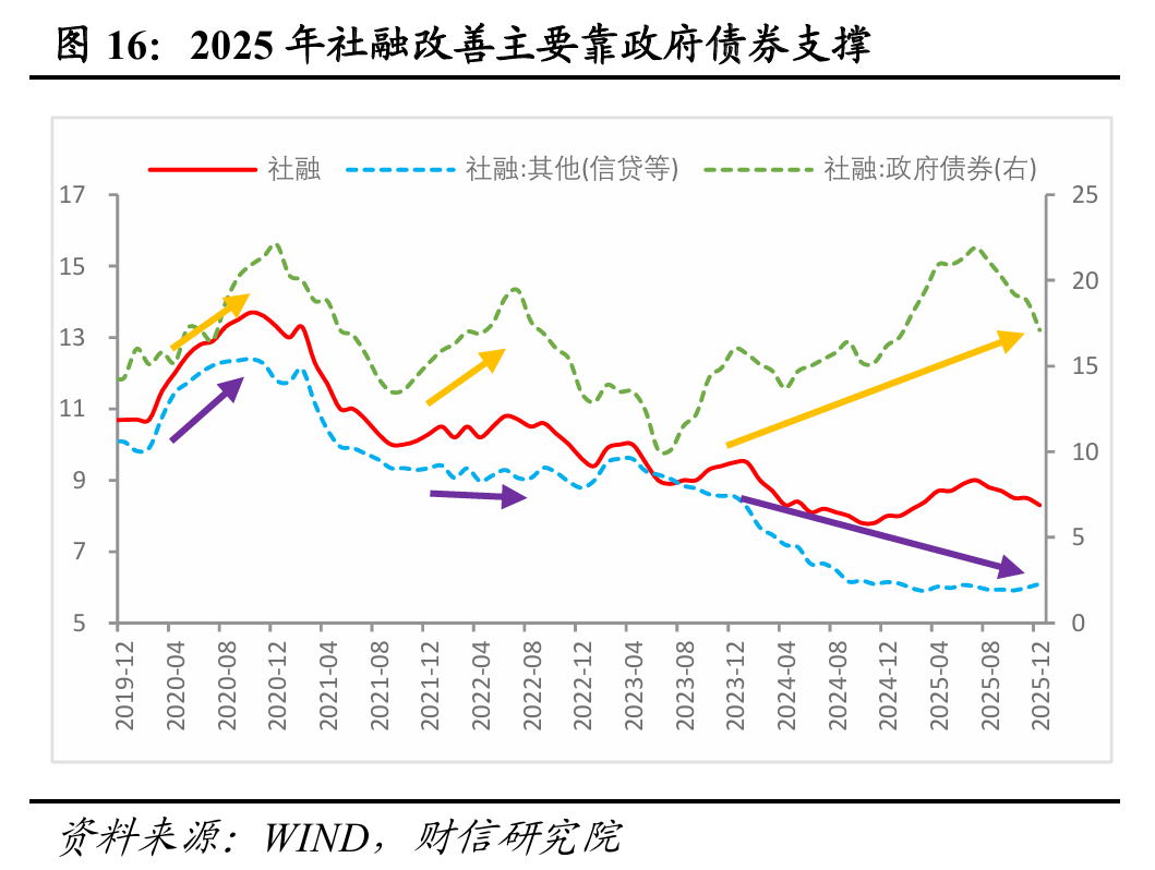 往后看,社融、M1增速走势主要取决财政发力节奏,2026年上半年或仍面临阶段性下行压力;但在政策性金融工具及结构性货币政策加力支持下,信贷增速边际企稳的可能性正在上升。预计货币政策将维持宽松基调,但鉴于近期八项结构性工具已落地,央行进一步全面降准降息,可能仍需等待经济持续走弱或外部冲击等触发因素出现。
