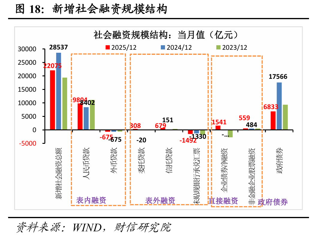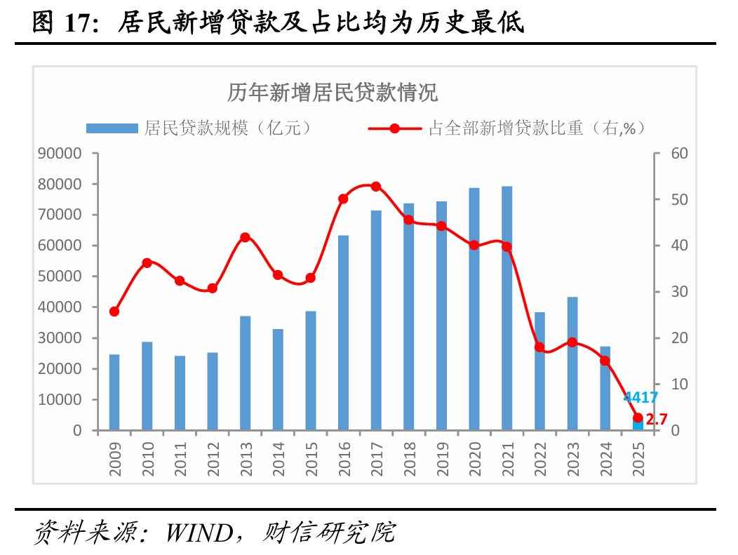 2025年金融数据呈现出“总量扩张、节奏靠前,但依赖财政、内生偏弱”的特征。一是总量上,社融、M2、M1增速分别增长8.5%、8.5%、3.8%,较上年提高0.5、1.2和2.6个百分点,对实体经济的支撑较为有力。二是节奏上,社融、M2、M1均于上半年加速上行,并在三季度依次见顶回落,呈“前高后低”走势。三是结构层面出现两重分化:1)社融增长主要依赖财政扩张(见图16),2025年政府债券同比多增2.54万亿元,贡献了社融全部同比多增额的76%,占社融比重由上年的35%提高至38.9%,同期信贷占比则由52.9%降至44.7%。2)信贷内部居民部门为主要拖累,全年新增居民贷款仅4417亿元,占全部新增信贷比重仅2.7%(见图17),较2017年52.7%的历史峰值显著回落,反映地产、消费等经济内生动能信贷需求疲弱;同时企业部门贷款亦主要依赖短贷,全年企业贷款同比多增1.14万亿元,其中短贷同比多增2.2万亿元、中长贷同比减少1.26万亿元。四是资金活化程度有所提高,住户存款中活期存款与定期及其他存款的增速差较上年提高1.9个百分点,企业存款与住户存款增速差较上年提高4.8个百分点。