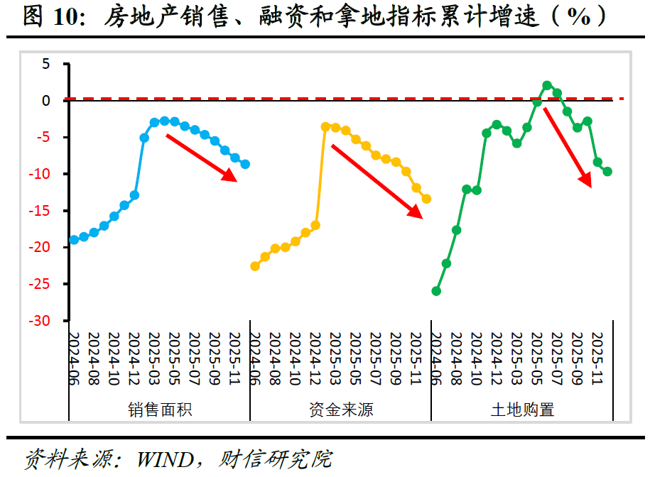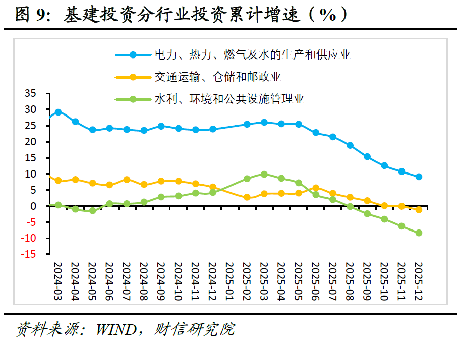 广义基建投资受地方化债和项目储备不足影响,增速转为负增长。1-12月广义基建投资同比下降1.5%,狭义基建投资同比下降2.2%,分别较1-11月回落1.6和1.1个百分点,地方化债挤占资金以及传统基建项目储备不足或是主要拖累。具体看,传统基建领域投资降幅进一步扩大,交通运输仓储邮政业、水利环境和公共设施管理业投资降幅分别较1-11月扩大1.1和2.1个百分点。而新基建相关投资仍具韧性,电力热力燃气及水生产供应业投资虽增速回落,仍实现9.1%的较高增长,为能源结构绿色转型提供重要支撑(见图9);同时狭义基建回落幅度小于上述行业,反映以互联网和相关服务业为代表的新基建投资可能有所回升。展望2026年,在专项债投向优化、新型政策性金融工具延续发力以及“十五五”重大项目启动的支撑下,基建投资有望温和回升,结构上传统“硬基建”与民生“软基建”并重,但需关注清理拖欠企业账款带来的短期压力。