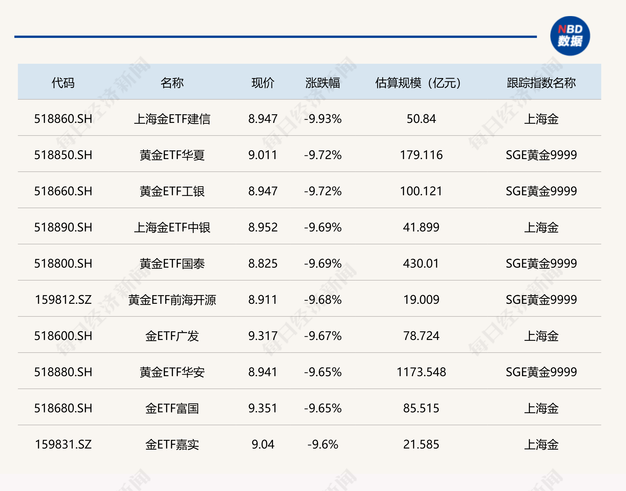 下跌方面,黄金相关ETF跌超9%。