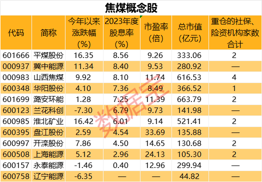 据证券时报·数据宝统计,A股中隶属焦煤行业个股有12只,普遍具有高股息、低估值的特点,为价值投资者所喜爱。以2023年末总市值和2023年年度分红总额计算,焦煤行业个股股息率平均为5.9%,其中7股股息率在6%以上,平煤股份、冀中能源、山西焦煤股息率均超过8%。