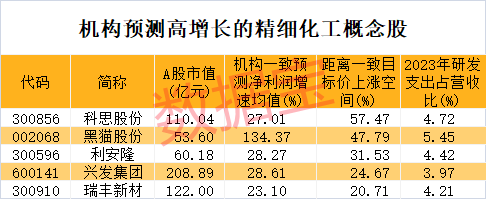 2023年研发支出超亿元,且研发支出占营收比例超过精细化工整体水平的概念股有20只。在这些概念股中,按照5家以上机构一致预测,2024年、2025年净利润增速均有望超20%的股票有5只,分别是黑猫股份、兴发集团、利安隆、科思股份、瑞丰新材。