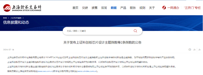 7月14日,上交所官网发布公告称,上交所和中证指数有限公司将于7月26日正式发布上证科创板芯片设计主题指数和上证科创板半导体材料设备主题指数,为市场提供更多科创板半导体产业投资标的。