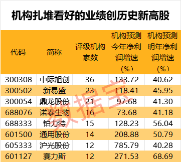 中际旭创机构关注度最高,获36家机构一致预测今明两年的净利润增长率分别为133.72%和40.62%。公司主营业务为高端光通信收发模块以及光器件的研发和生产,预计上半年实现净利润21.5亿元至25亿元,同比增加250.30%至307.33%,主要与公司高端产品出货比重快速增长、产品结构持续优化等因素有关。