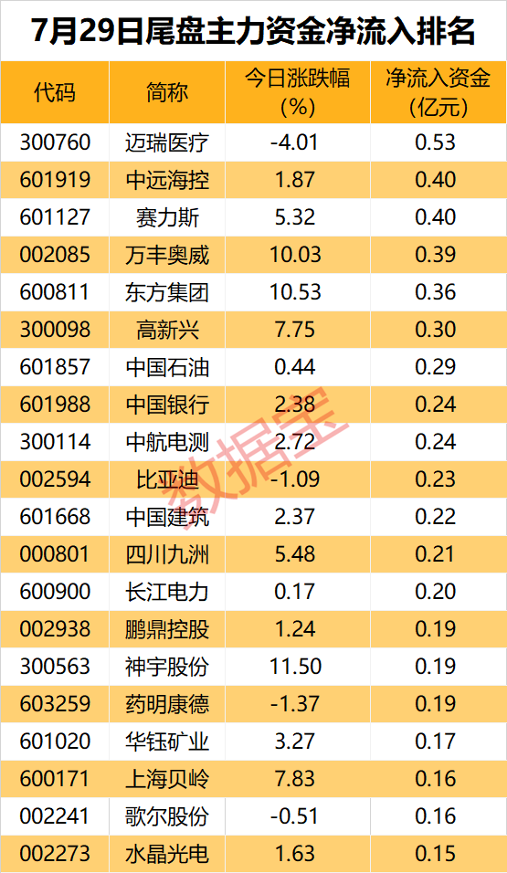 个股方面,迈瑞医疗、中远海控、赛力斯等28股尾盘净流入资金超千万元。