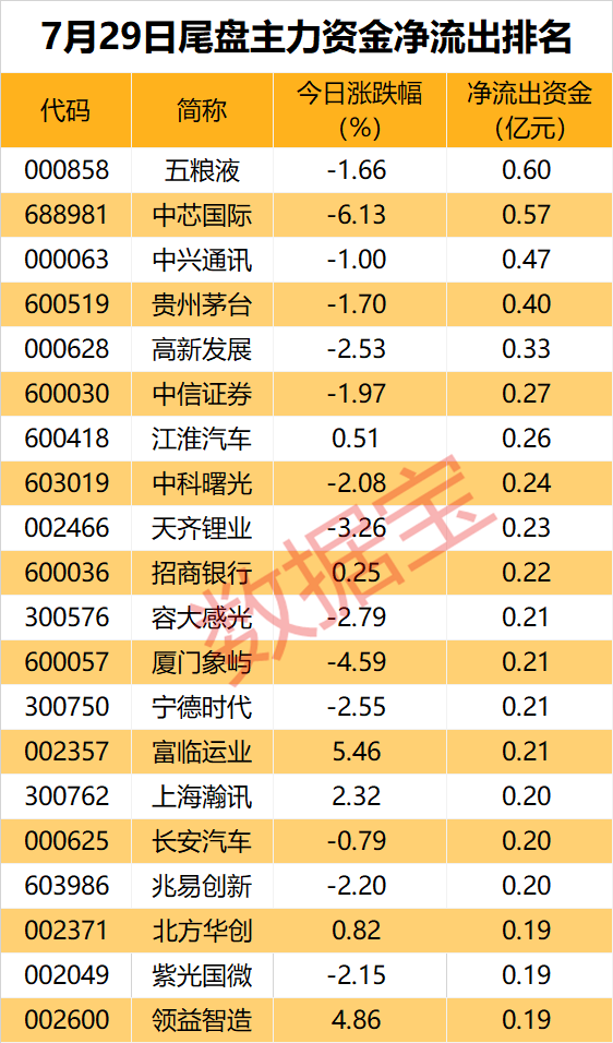 五粮液的尾盘主力资金净流出额最高,达0.6亿元。中芯国际、中兴通讯、贵州茅台、高新发展等6股的尾盘净流出额居前,均超3000万元。