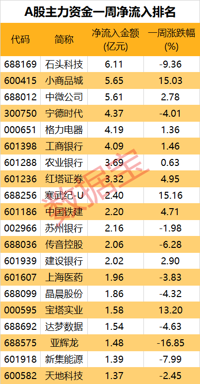 净流入方面,本周35股主力资金净流入在1亿元以上。石头科技、小商品城、中微公司排名前三,主力分别净流入6.11亿元、5.65亿元、5.61亿元。