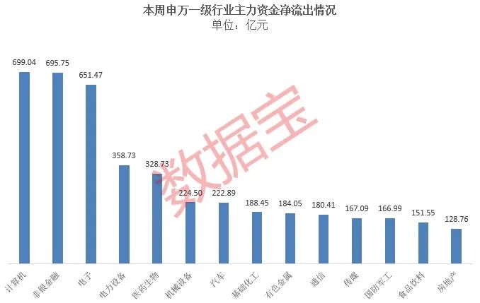 申万一级行业全部遭到主力资金撤离,14个行业净流出额逾百亿元。其中,计算机、非银金融、电子行业主力资金净流出额居前,分别为699.04亿元、695.75亿元、651.47亿元;电力设备、医药生物行业净流出额超过300亿元;机械设备、汽车行业净流出额超过200亿元。