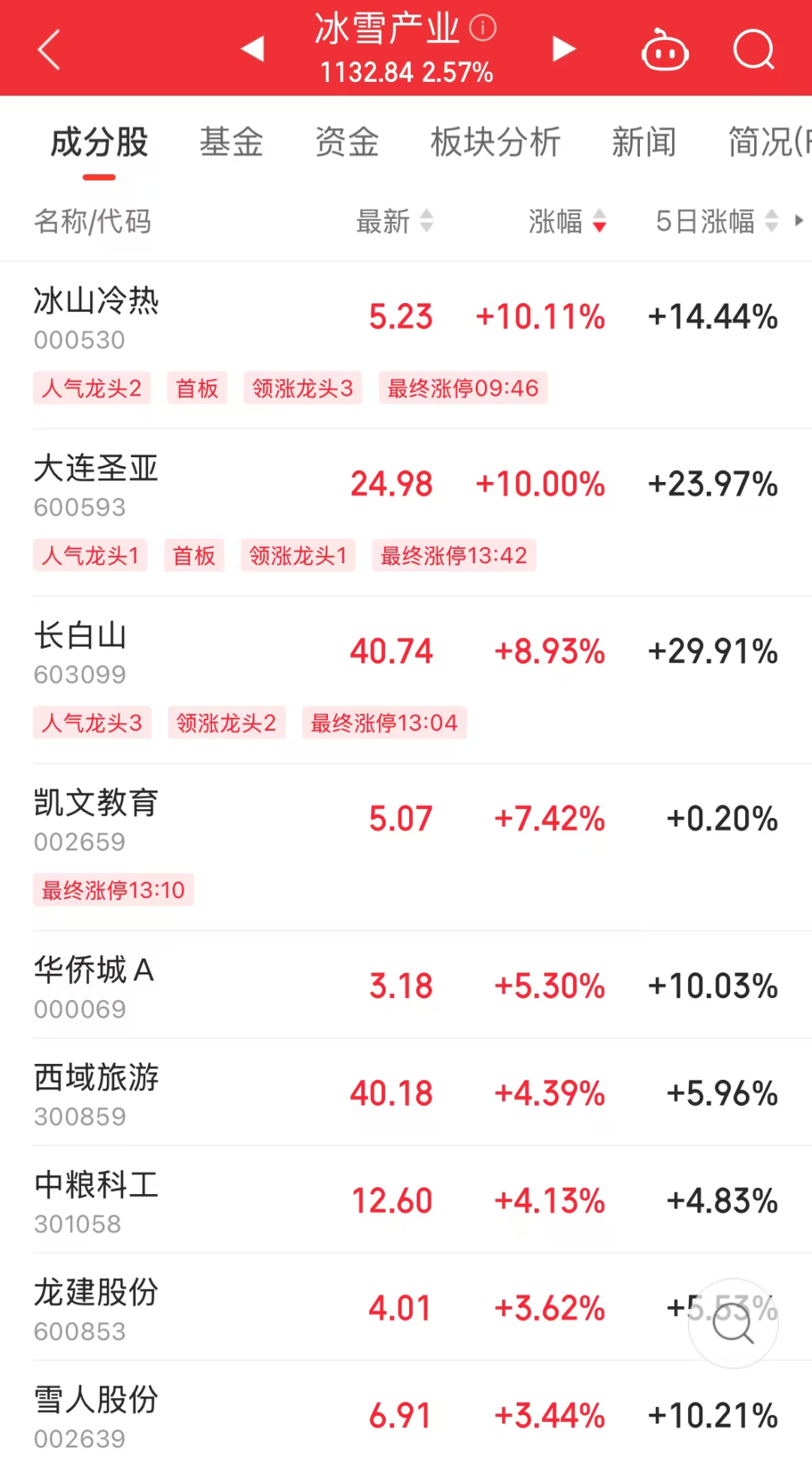 截至收盘,冰山冷热、大连圣亚收获涨停板,长白山、西域旅游、中粮科工等涨幅均超4%。