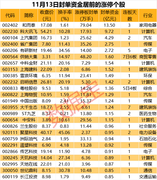 以封单金额计算,16股封单资金超亿元,和而泰、科大讯飞、上汽集团封单资金居前,分别为13.5亿元、9.72亿元、4.29亿元。
