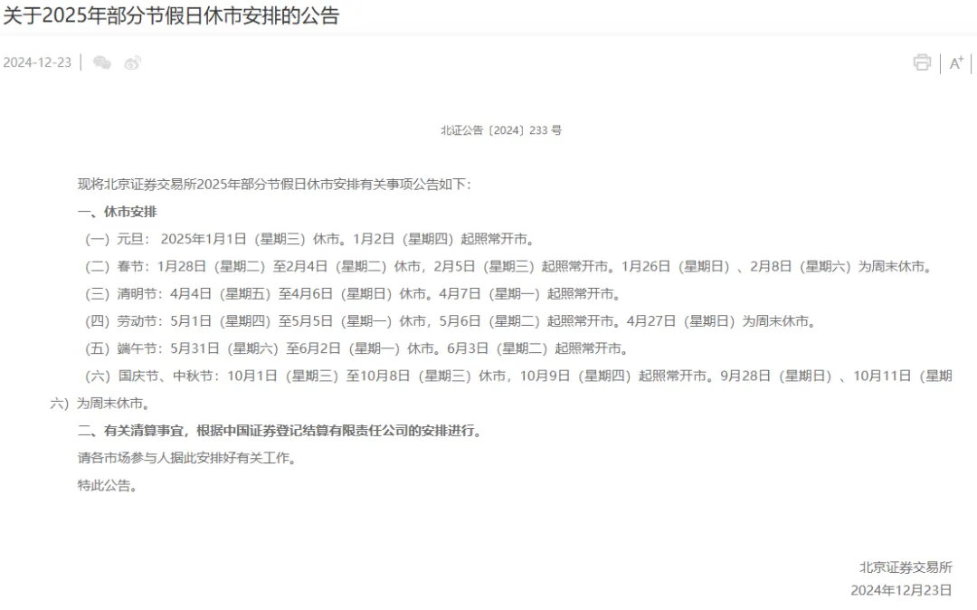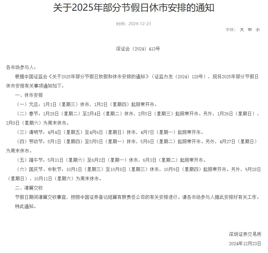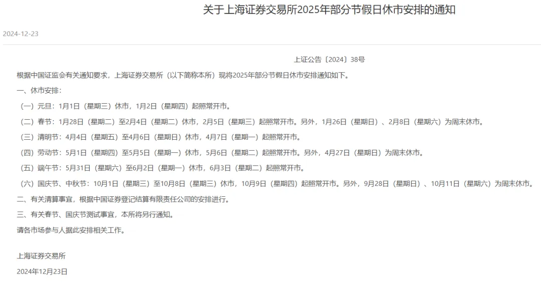 2025年休市安排出炉。