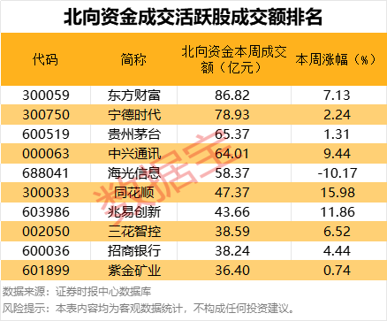 本周共有36只股上榜深沪港通成交活跃榜,北向资金合计买入及卖出成交额居首的是东方财富,合计成交额86.82亿元。