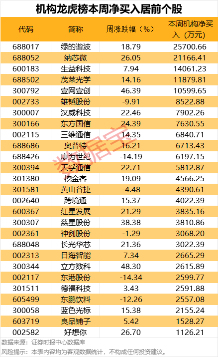 龙虎榜数据显示,本周机构专用席位共现身109只个股,净买入45只,净卖出64只。其中,27股获机构净买入超千万元,绿的谐波、纳芯微等机构净买入金额超亿元。