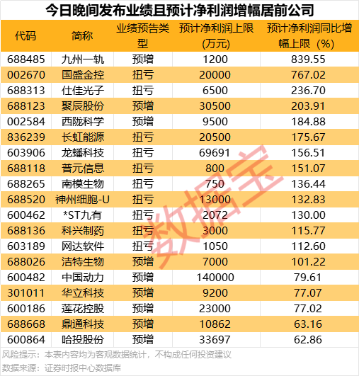 业绩预告也批量公布,截至发稿,今日晚间260余家公司发布2024年业绩预告,按预计净利润增幅上限统计,九州一轨、国盛金控、仕佳光子、聚辰股份等预计净利润增幅居前。