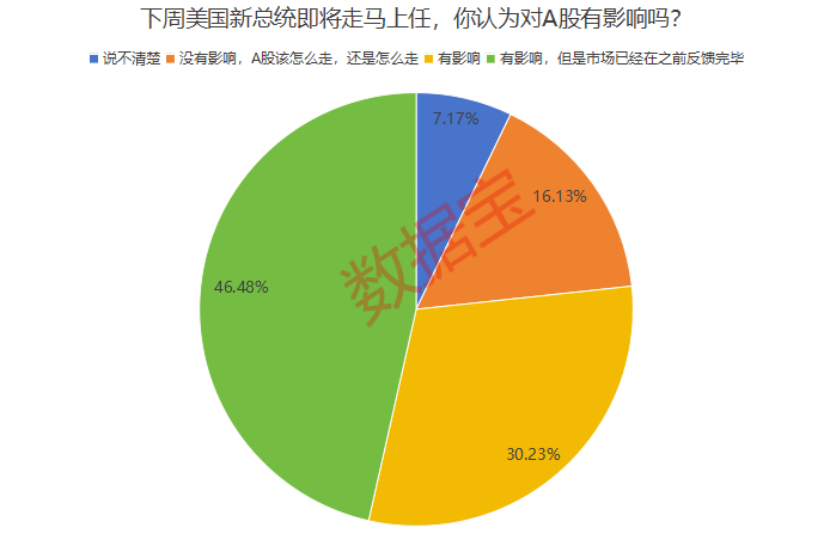 在“下周美国新总统即将走马上任,你认为对A股有影响吗?”的调查中,有超77%的受访者认为是有影响的。其中表示 “有影响,但是市场已经在之前反馈完毕”的观点占比高达46.48%;认为“有影响”的比例30.23%。还有表示“没有影响,A股该怎么走,还是怎么走”的受访者有16.13%。