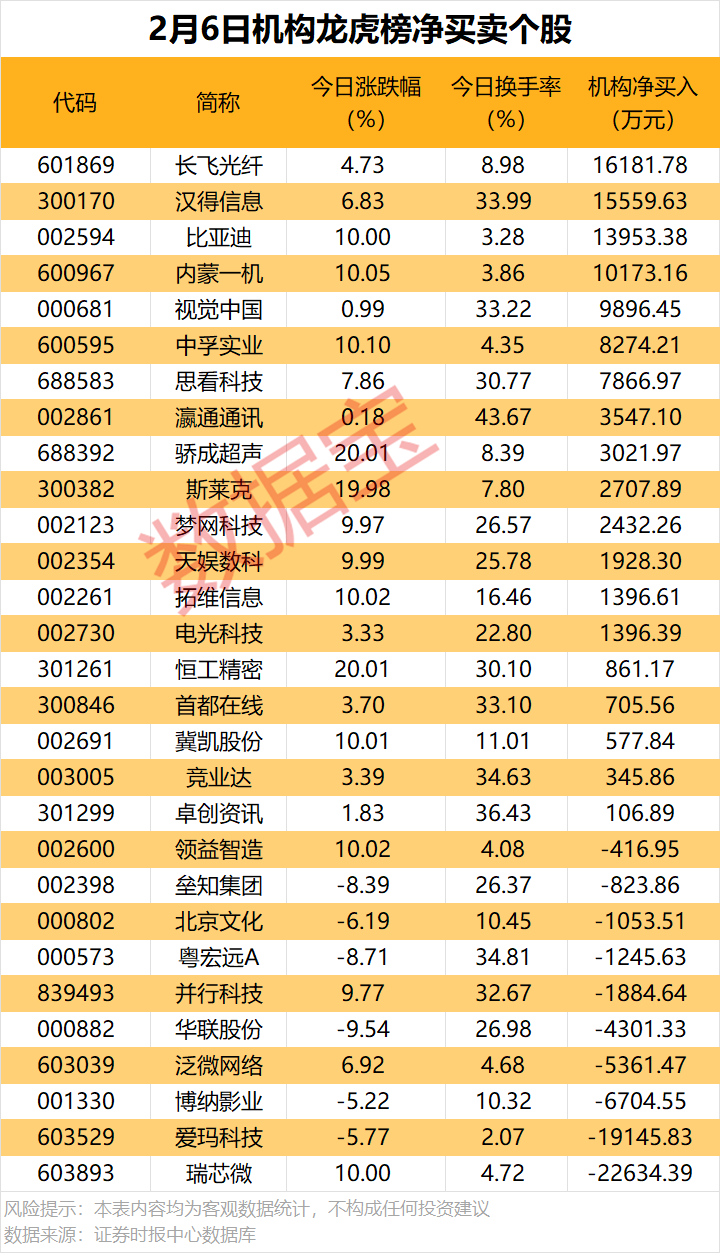 2月6日龙虎榜中,19股获机构净买入,净买入金额居首的是长飞光纤,机构净买入1.62亿元,其次是汉得信息、比亚迪、内蒙一机,机构净买入均超亿元。