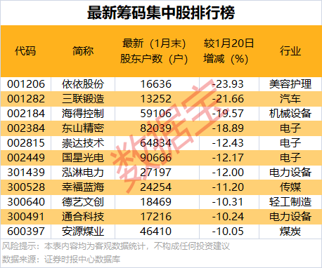 股东户数降幅最多的是依依股份,截至1月末最新股东户数为16636户,较1月20日下降23.93%,其次是三联锻造,截至1月末最新股东户数为13252户,较1月20日下降21.66%。