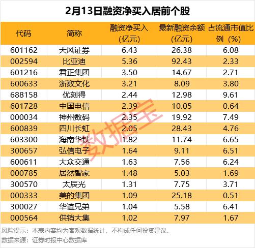 具体到个股,获融资净买入千万元以上的有410只,其中16只融资净买入额超亿元。天风证券融资净买入额居首,当日净买入6.43亿元;其次是比亚迪、君正集团,融资净买入金额分别为5.36亿元、3.50亿元;融资净买入金额居前的还有浙数文化、优刻得、中国电信等。
