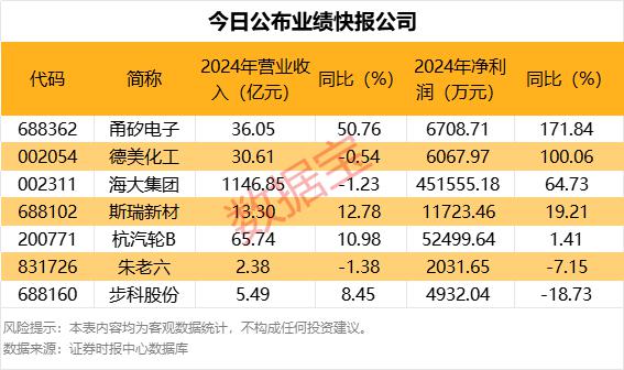 今日共7家公司发布业绩预告,甬矽电子2024年实现净利润6708.71万元,同比扭亏为盈,德美化工、海大集团2024年净利润大幅增长。