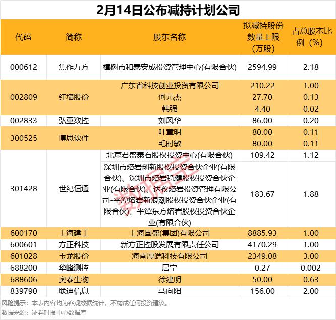 2月14日共有11家公司披露股东减持计划,拟减持股份比例较高的有世纪恒通、玉龙股份等。