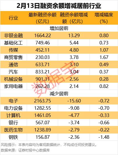分行业统计,申万所属一级行业有17个行业融资余额增加,非银金融行业融资余额增加最多,较上一日增加13.29亿元;融资余额增加居前的行业还有基础化工、传媒、商贸零售等,融资余额分别增加5.44亿元、4.80亿元、3.78亿元。