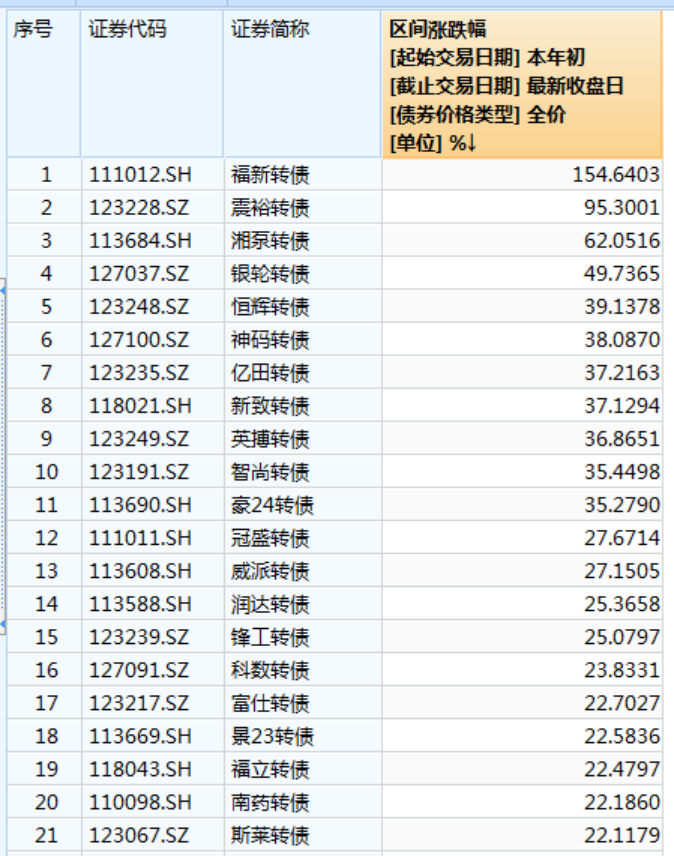 Wind数据显示,福新转债年内涨幅已超150%,为今年以来首只翻倍的转债。震裕转债年内涨幅接近翻倍,湘泵转债涨超60%,恒辉转债、亿田转债、新致转债等多只可转债年内涨幅超30%。