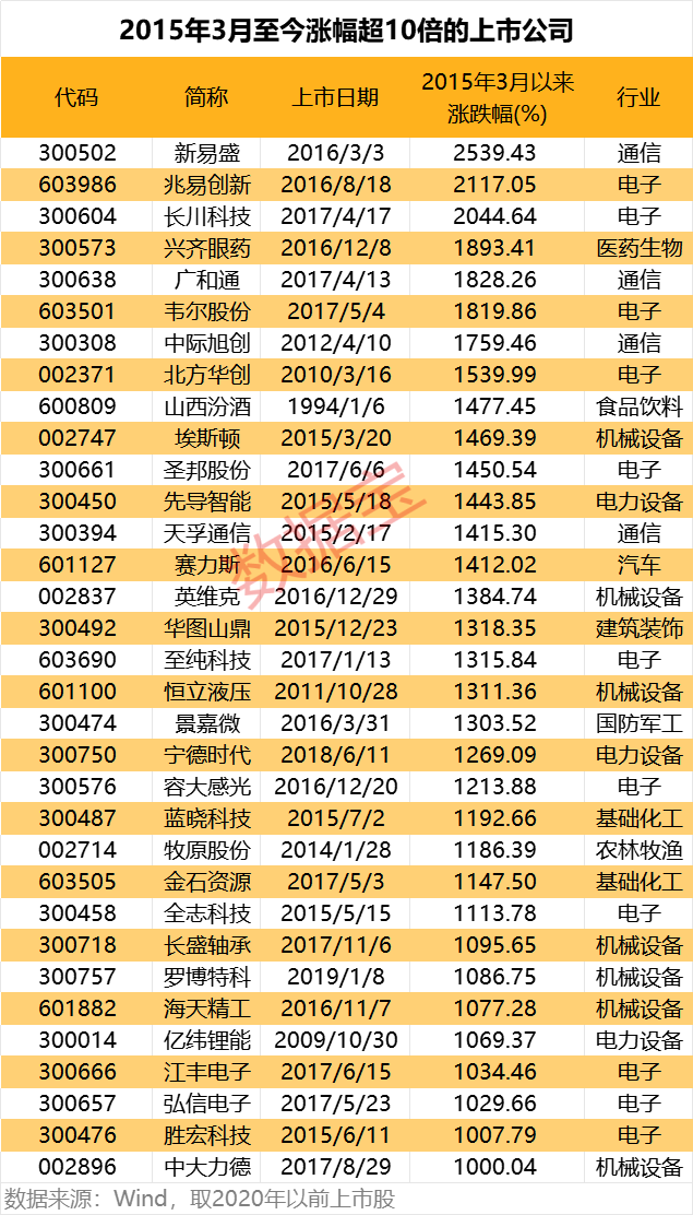 上述33只10倍牛股都有何特征?笔者从行业分布、基本面、成交活跃度、业绩、机构关注度等多个维度去逐一剖析。