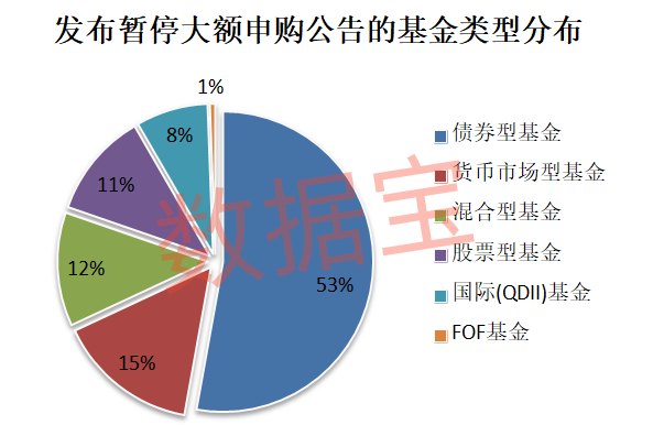 货币市场型、混合型基金、股票型基金占比均超过10%,国际(QDII)基金占比在10%以内。FOF基金占比最低,不到1%。这表明不同投资策略和风险特征的基金,都可能因各自原因采取限制大额申购的措施。