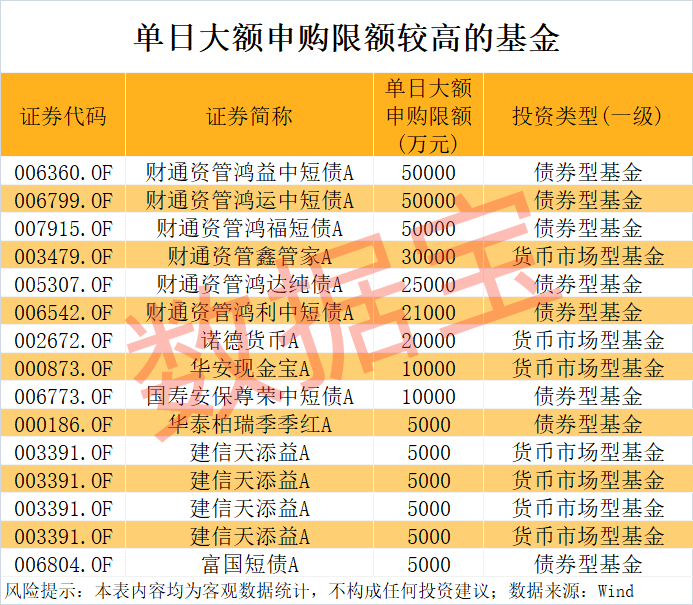 如财通资管鸿益中短债A,暂停大额申购且限额为5亿元;财通资管鑫管家A限额3亿元,限额亿元以上的还有财通资管鸿达纯债A、财通资管鸿利中短债A、诺德货币A、华安现金宝A、国寿安保尊荣中短债A,这些基金普遍属于债券型基金或货币市场型基金。