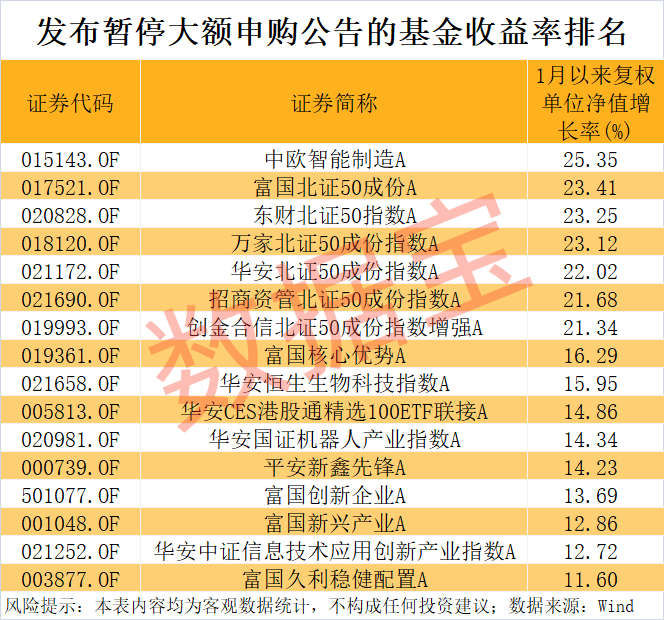 3月1日,中欧智能制造A、华富收益增强A、国联安增利债券A均发布暂停大额申购的公告。中欧智能制造A在公告中提到,为进一步保证本基金的稳定运作,保护基金份额持有人利益,根据相关规定,中欧基金决定自2025年3月3日(含)起限制本基金的申购、转换转入及定期定额投资业务的金额,限制申购金额为10万元。