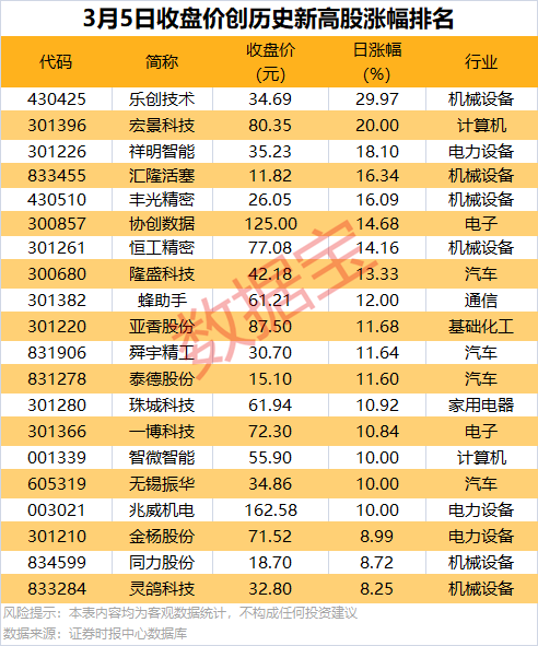 收盘价创历史新高股中,今日股价平均上涨8.12%,涨停的有乐创技术、宏景科技、智微智能等,涨幅居前的有祥明智能、汇隆活塞、丰光精密等。