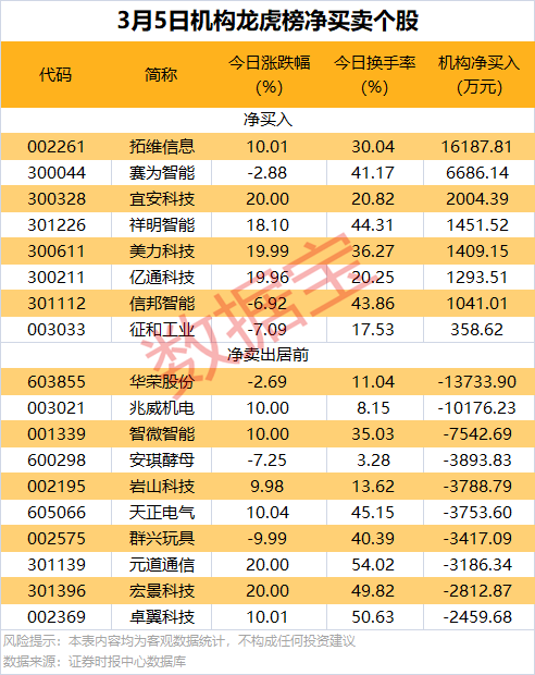 3月5日龙虎榜中,共8股获机构净买入,拓维信息获机构净买入1.62亿元,净买入金额居首;其次是赛为智能,机构净买入6686万元。机构净卖出金额居前的有华荣股份、兆威机电,机构净卖出均超亿元。