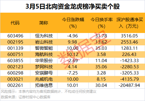 北向资金今日现身9只股龙虎榜,净买入最多的是恒为科技,净买入3516万元;其次是岩山科技,北向资金净买入2553万元。