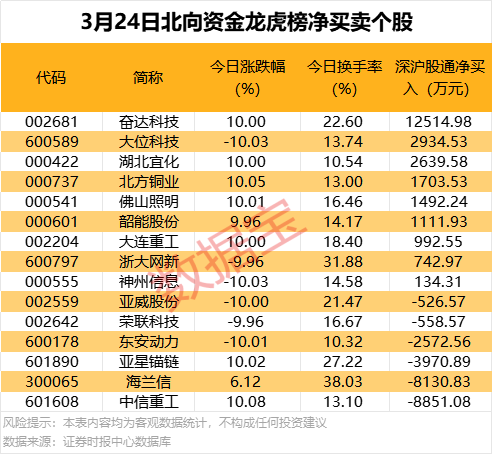 北向资金今日现身15只股龙虎榜,净买入最多的是奋达科技,净买入1.25亿元,大位科技、湖北宜化获净买入均超2000万元;北向资金净卖出前三的是中信重工、海兰信、亚星锚链,这3只股也均属于海工装备板块。