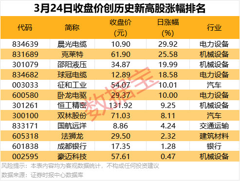 收盘价创历史新高股中,今日涨停的有晨光电缆、邵阳液压、征和工业等;涨幅居前的有克莱特、球冠电缆、恒工精密等。
