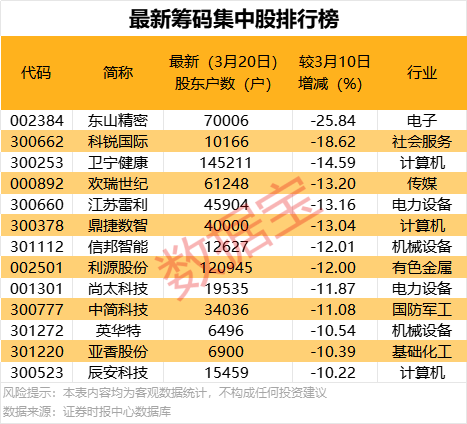 股东户数降幅最多的是东山精密,截至3月20日最新股东户数为70006户,较3月10日下降25.84%;其次是科锐国际,截至3月20日最新股东户数为10166户,较3月10日下降18.62%。