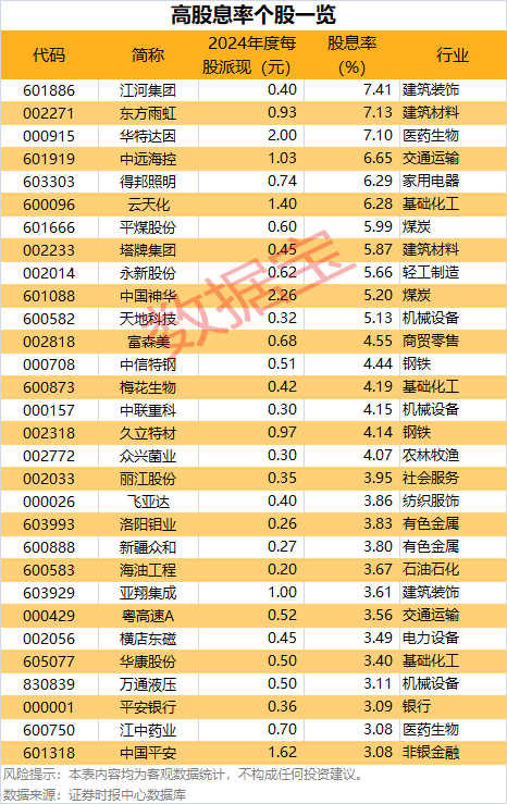 以2024年度的每股派现金额及当年末收盘价为基准统计,已公布派现方案公司中,共有34家公司股息率超过3%。