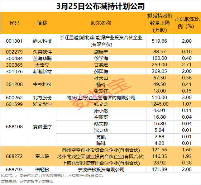 3月25日共有11家公司披露股东减持计划,拟减持股份比例居前的有富吉瑞、北方股份等。