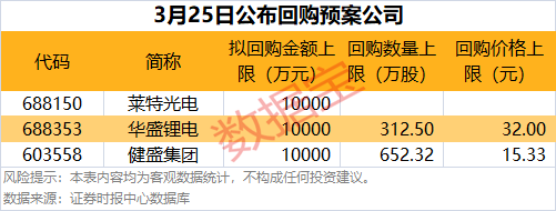 3月25日,莱特光电、华盛锂电、健盛集团等3家公司披露股份回购方案,3家公司拟回购资金总额均在5000万元—1亿元之间。