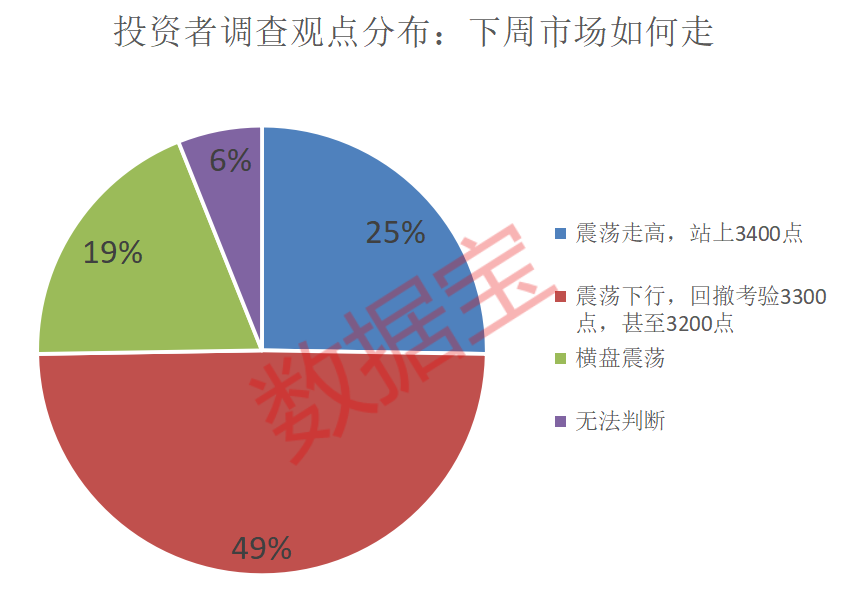 对于接下来一周的大盘走势,多数投资者认为大盘将“震荡下行,回撤考验3300点,甚至3200点”,占比49%,较上期来看比例大幅度提升(上一期为40%)。认为“震荡走高,站上3400点”的观点比例继续下降,从上期的33%下降至25%。