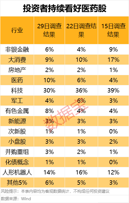 对于接下来潜力板块和方向选择,科技方向(包含人形机器人)占比依旧最高。通过近几期的调查结果观察,投票医药板块的比例在持续上涨,从15日调查结果的4%比例提升至上期的6%,本期投票医药板块的比例增长至10%,是增幅最大的行业板块。