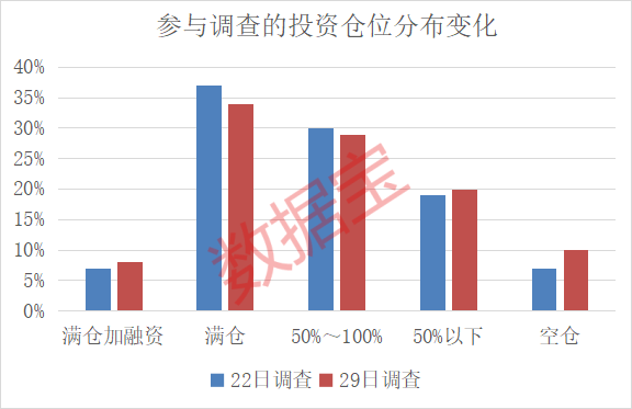 通过调查发现,本周较上期操作上来看,“加仓”的比例大幅度降低,为18%,减少了10个百分点。“清仓”的受访者本期为12%,而上一期数据为9%。“持仓不动”的比例有所上升,本期为47%,上一期数据为43%。“减仓”比例较上期提升2个百分点至22%。