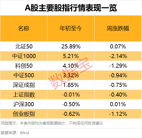 本周(3月24日至3月28日),沪指下跌0.4%,深证成指下跌0.75%,创业板指下跌1.12%,北证50指数上涨0.07%、科创50指数下跌1.29%。可交易A股中,上涨的有1345只,占比24.93%,下跌的4000只。