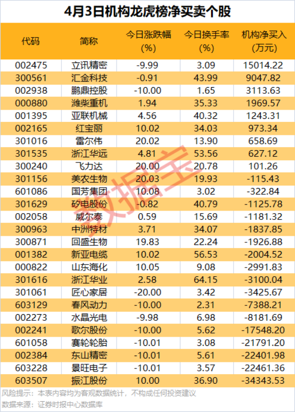 4月3日龙虎榜中,共5股获机构净买入超千万元,立讯精密跌停,机构净买入1.5亿元,净买入居首。机构净卖出个股中,振江股份、景旺电子、东山精密、赛轮轮胎、歌尔股份等5股均遭净卖出超亿元。