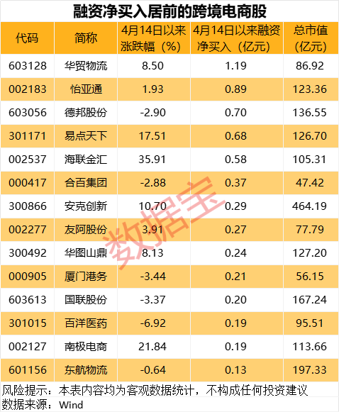 从资金流向上来看,多股4月14日以来获得杠杆资金加仓,华贸物流、怡亚通、德邦股份融资净买入额分别为1.19亿元、0.89亿元、0.7亿元。