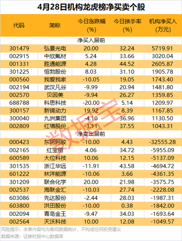 4月28日的龙虎榜中,共11股获机构净买入超千万元,弘景光电获机构净买入5720万元,净买入居首,其次是中欣氟材、胜通能源,获机构净买入均超2000万元。