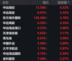 港股中航运股昨日尾盘同样走强。中远海控大涨8.52%;中远海发上涨5.43%;中远海能、中国外运、太平洋航运、中远海运国际等多只航运股跟涨,涨幅均超过2%。